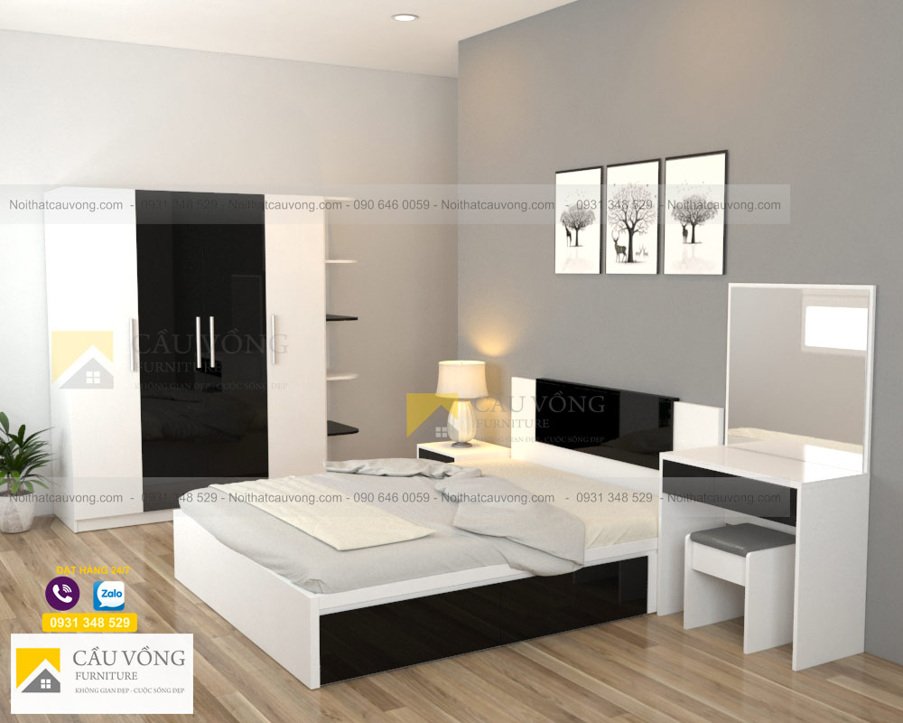 Bộ phòng ngủ màu đen và màu trắng kết hợp, tủ áo kết hợp cánh đen và trắng, có cục góc bo tròn hiện đại
