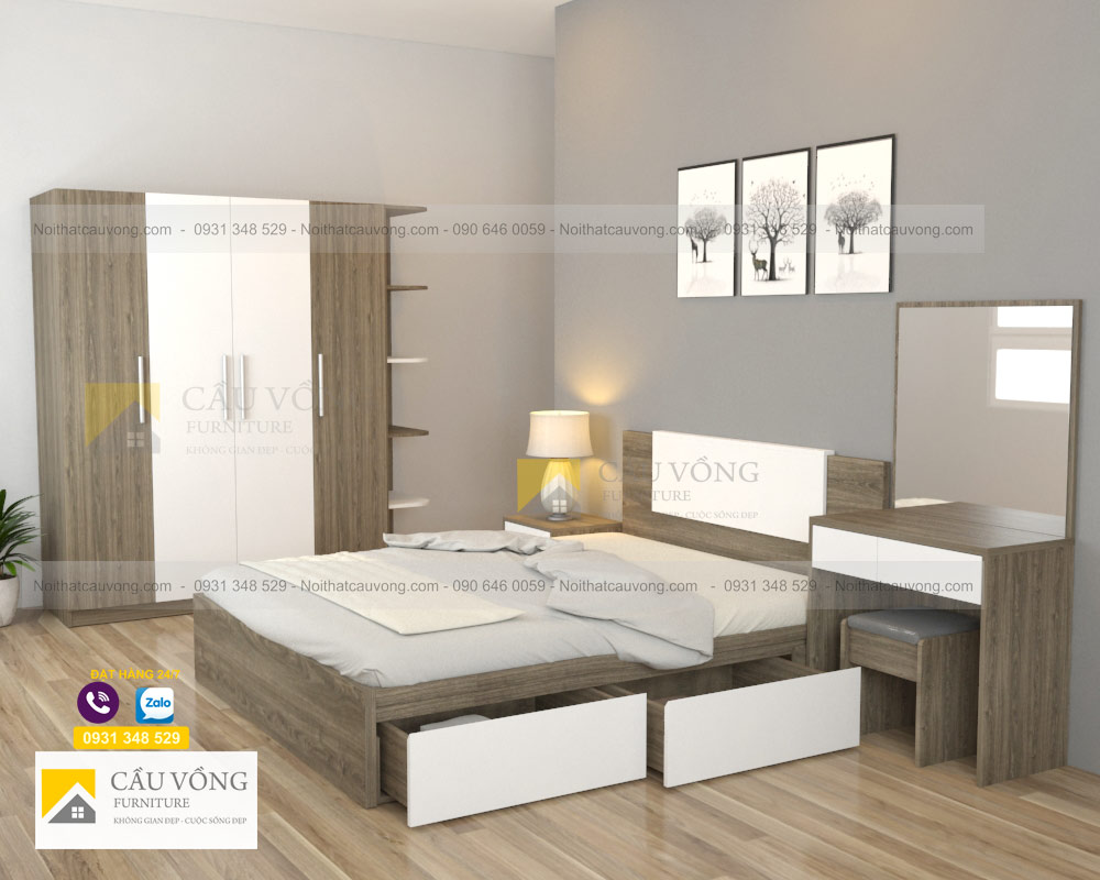 Bộ phòng ngủ được kết hợp màu gỗ melamine sồi và trắng