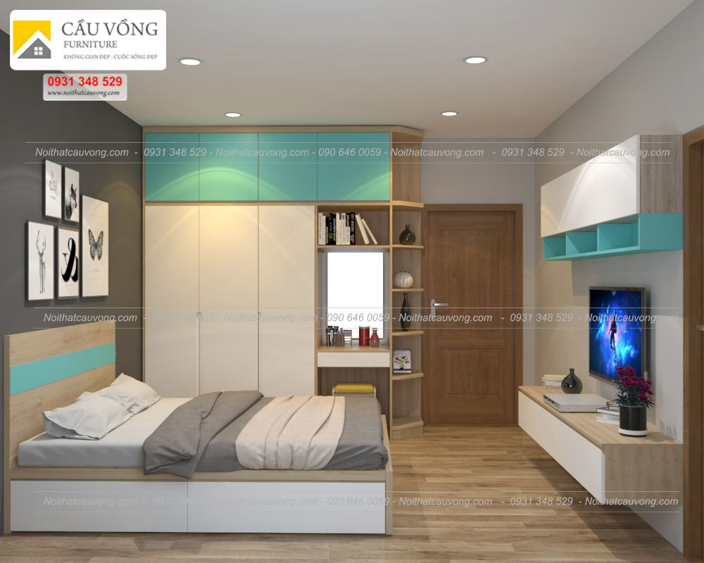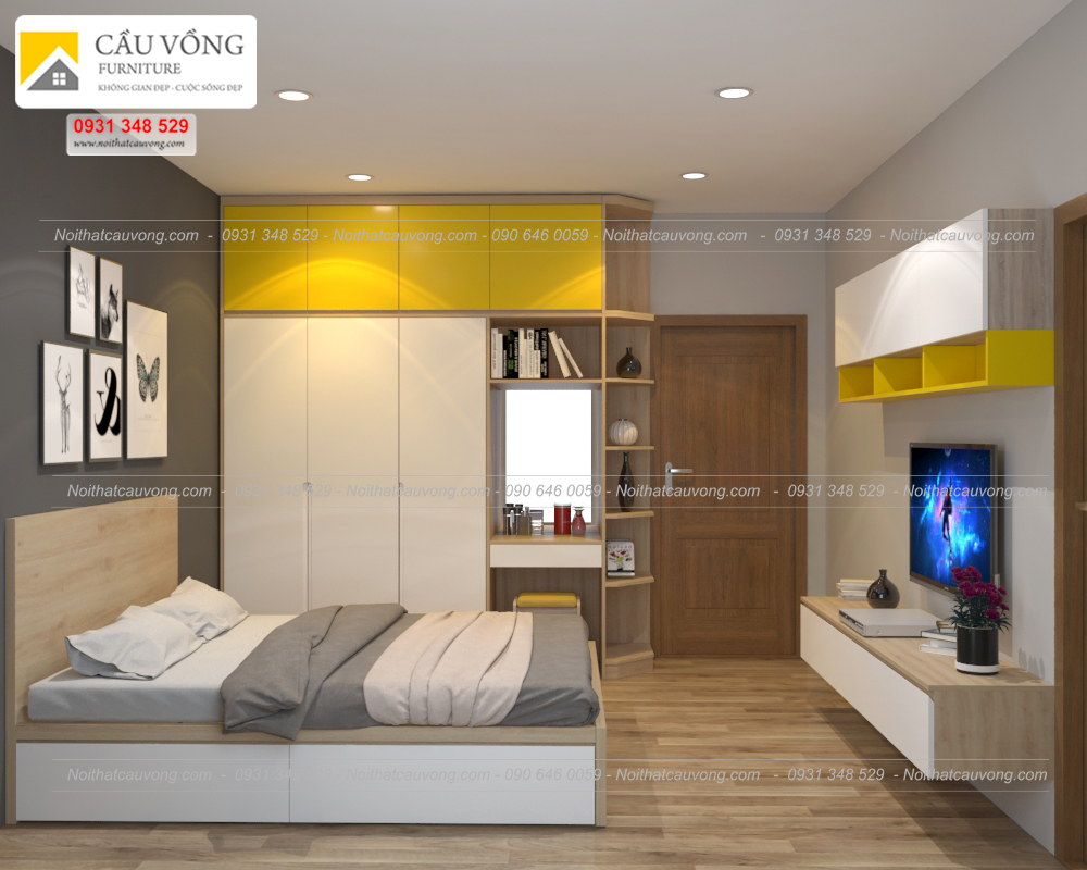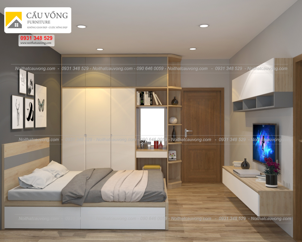 Bộ phòng ngủ hiện đại bao gồm: Tủ quần áo, giường ngủ, kệ tivi treo tường. Kính thước sẽ tùy chỉnh thay đổi theo kích thước thực tế