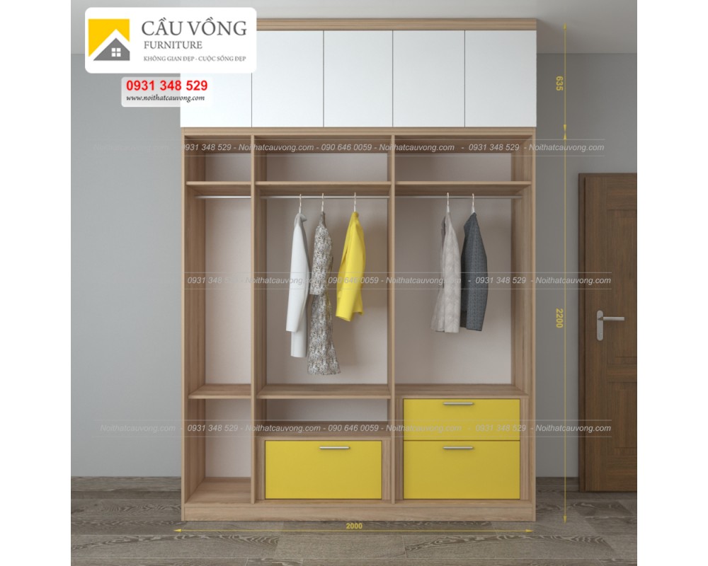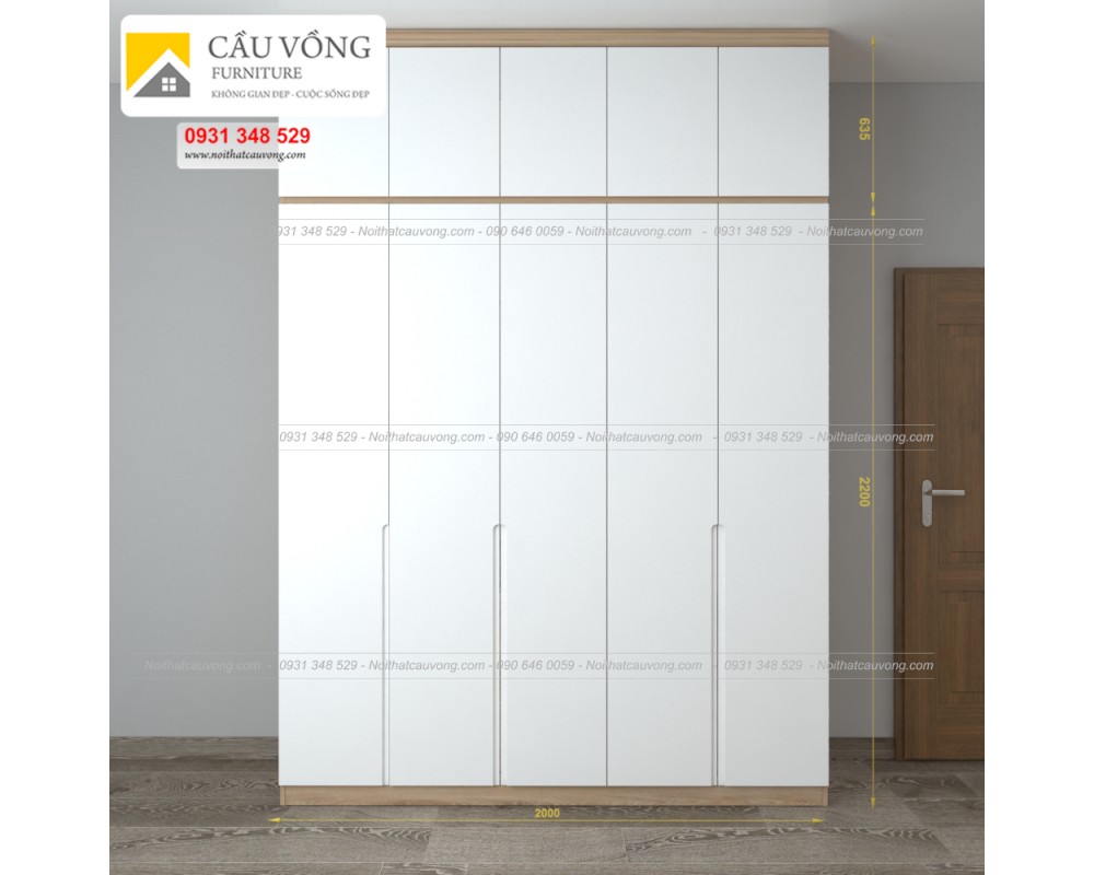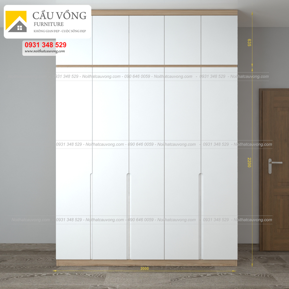 Bố trí bên trong tủ quần áo 5 cánh mở, tủ quần áo hiện đại giá rẻ kết hợp màu gỗ và sơn trắng.