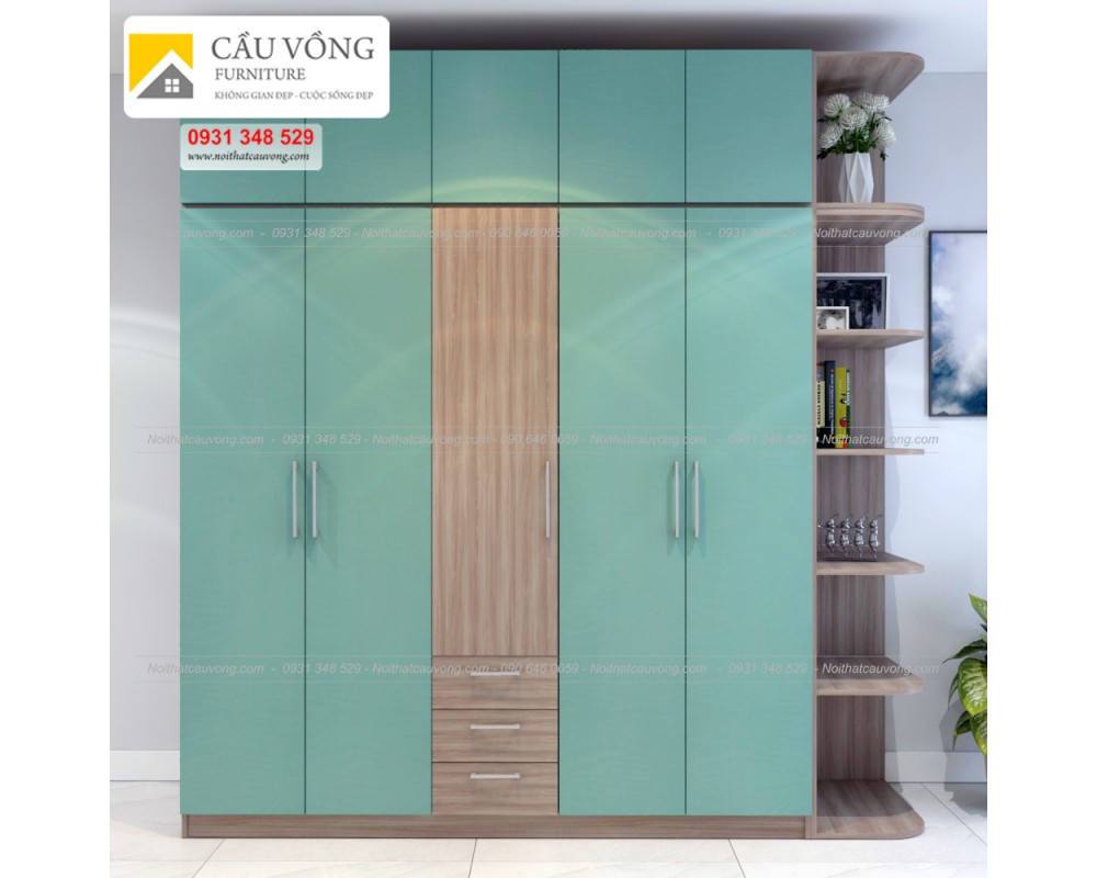 Tủ quần áo đẹp gỗ MFC Melamine An Cường màu gỗ kết hợp màu xanh trẻ trung, hiện đại, tủ quần áo thiết kế hiện đại cánh mở màu xanh xen kẽ màu gỗ, bên hông tủ có kệ góc