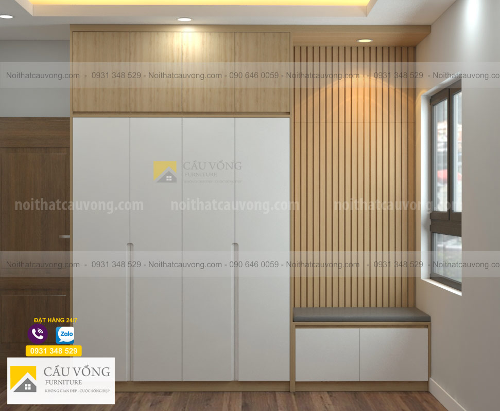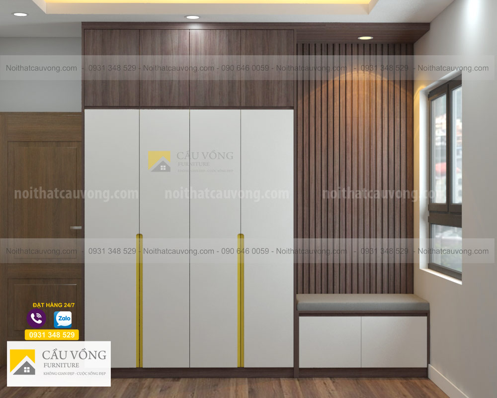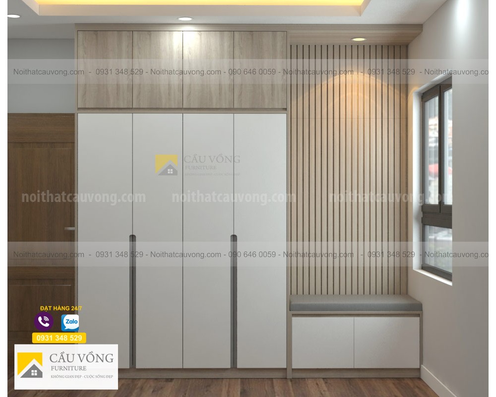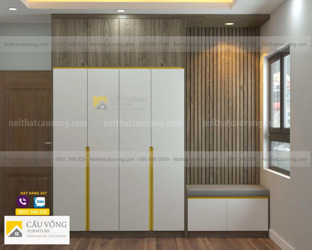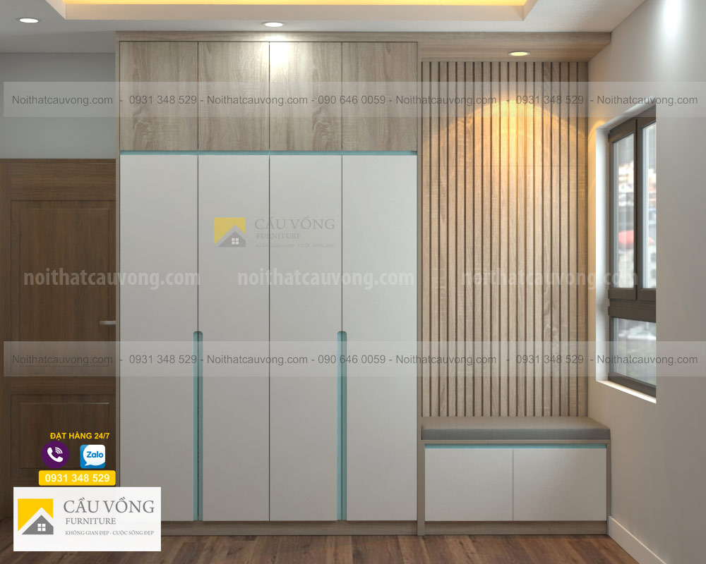Mẫu Tủ quần áo hiện đại TA103 được thiết kế hiện đại, tủ áo được kết hợp Melamine màu gỗ và cánh sơn trắng, cánh tủ tay nắm âm đẹp, tủ áo được thiết kế có bục ngồi cạnh cửa sổ, phía sau được ốp thanh lam tường tạo không gian hiện đại. sau một ngày làm việc mệt nhọc bạn có thể ngồi thư giãn ngắm phố xá, đọc sách....